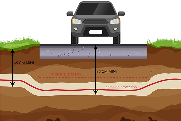 Cette ligne se compose d’un fil 3×1.5mm² à enterrer dans une gaine de protection de couleur rouge. Pour son passage, il vous faut creuser une tranchée à 65 cm de profondeur (jusqu’à 85 cm sous les voies de circulation afin de supporter le poids) dans laquelle vous disposez la gaine sur toute la longueur. Pensez à protéger les câbles enterrés. Pour ce faire, l’utilisation d’un grillage avertisseur rouge enterré à 30 cm au-dessus de votre gaine est un excellent choix en matière de sécurité.