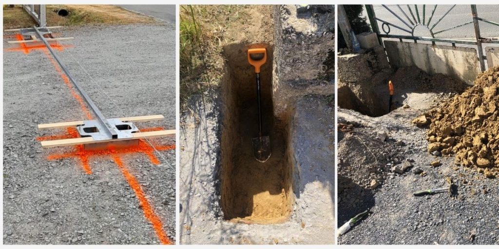 Une fois le gabarit monté, installez-le à l’endroit où vous souhaitez poser votre portail en aluminium. Puis, marquez d’un coup de bombe les fouilles des fondations pour tracer le terrassement. Vous n’avez plus qu’à retirer le gabarit et creuser les deux trous d’encastrement de votre portail coulissant alu. Ces derniers accueilleront les futurs plots en béton qui supporteront les piliers de votre portail coulissant motorisé.