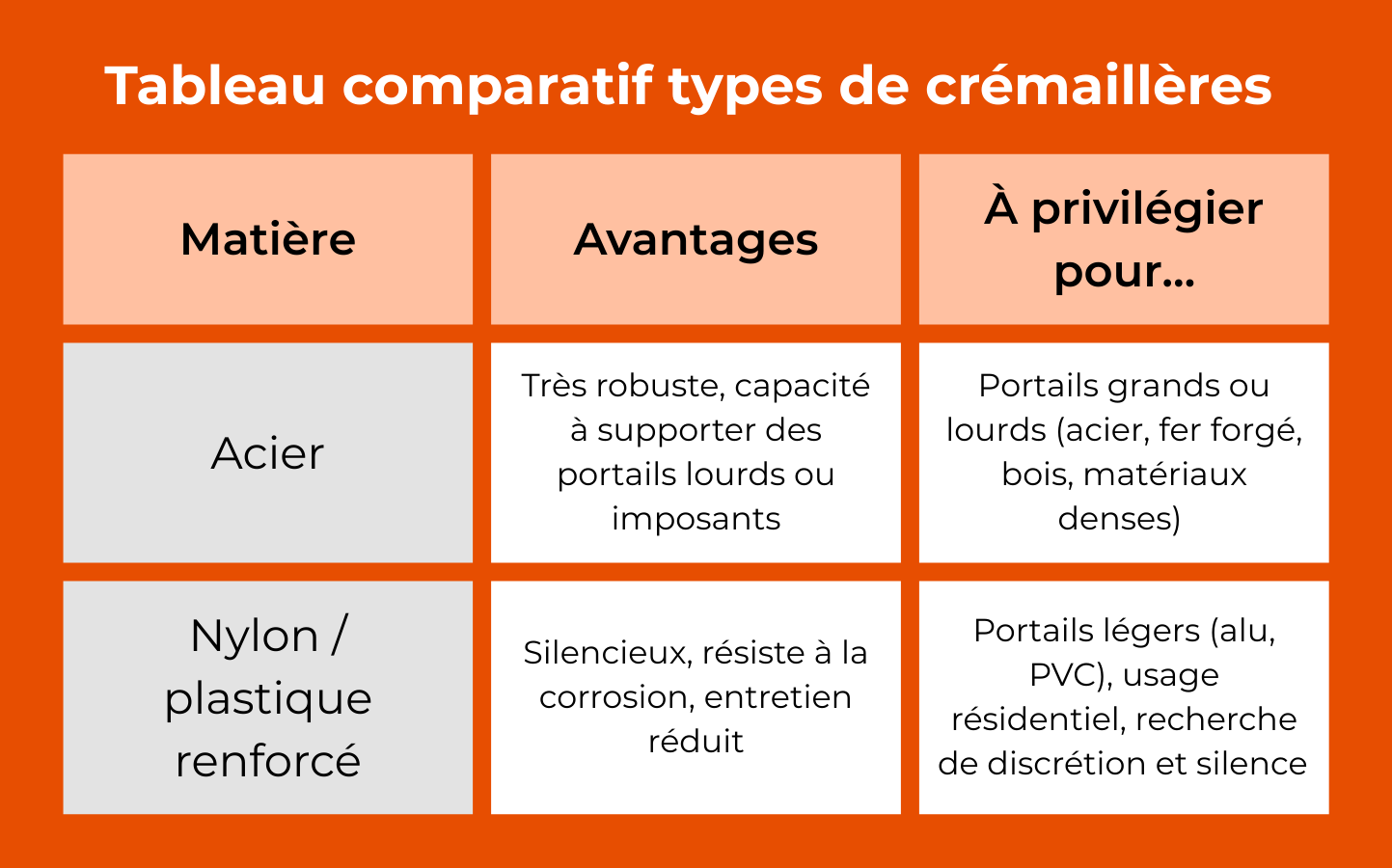 - Pensez également à choisir le bon matériau selon le poids du portail. Inutile d’opter pour un modèle en acier si votre portail est léger. Une crémaillère en nylon, plus abordable, ne craint ni rouille ni corrosion. Elle est idéale pour un portail en aluminium aux dimensions standard.