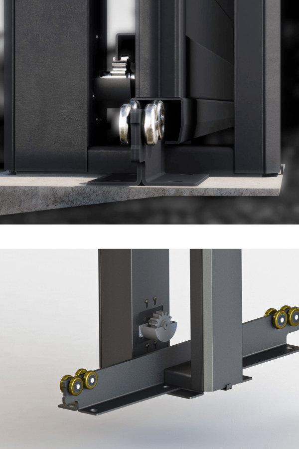 Pas de rail au sol, pas de longrine en béton, pas de risques de blocage. Le portail est suspendu au-dessus du sol et glisse en douceur sur un jeu de galets fixés au sol.